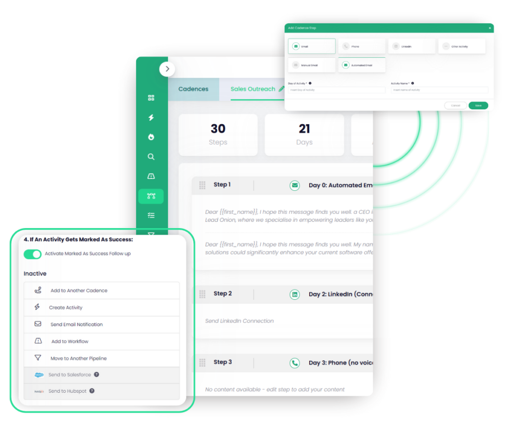 Stay consistent, save time, and keep every follow-up on track. Lead Onion’s Sales Automation Cadences give your team a repeatable structure for every touchpoint, across email, phone, and LinkedIn, so no lead slips through the cracks.